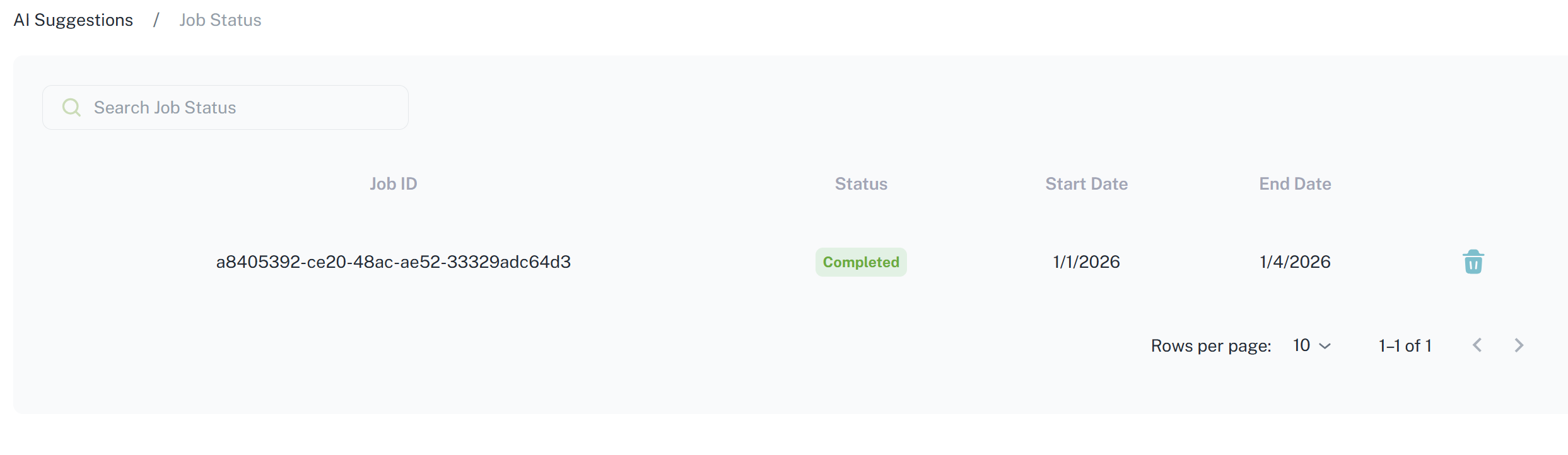 Ai Suggestions - اقتراحات الذكاء الاصطناعي Job Status - العمليات تعرض حالة عملية سحب الاقتراحات Ai التي تم توليدها خلال فترة زمنية محددة ويمكن إيقافها بالضغط على زر الحذف السابق التالي