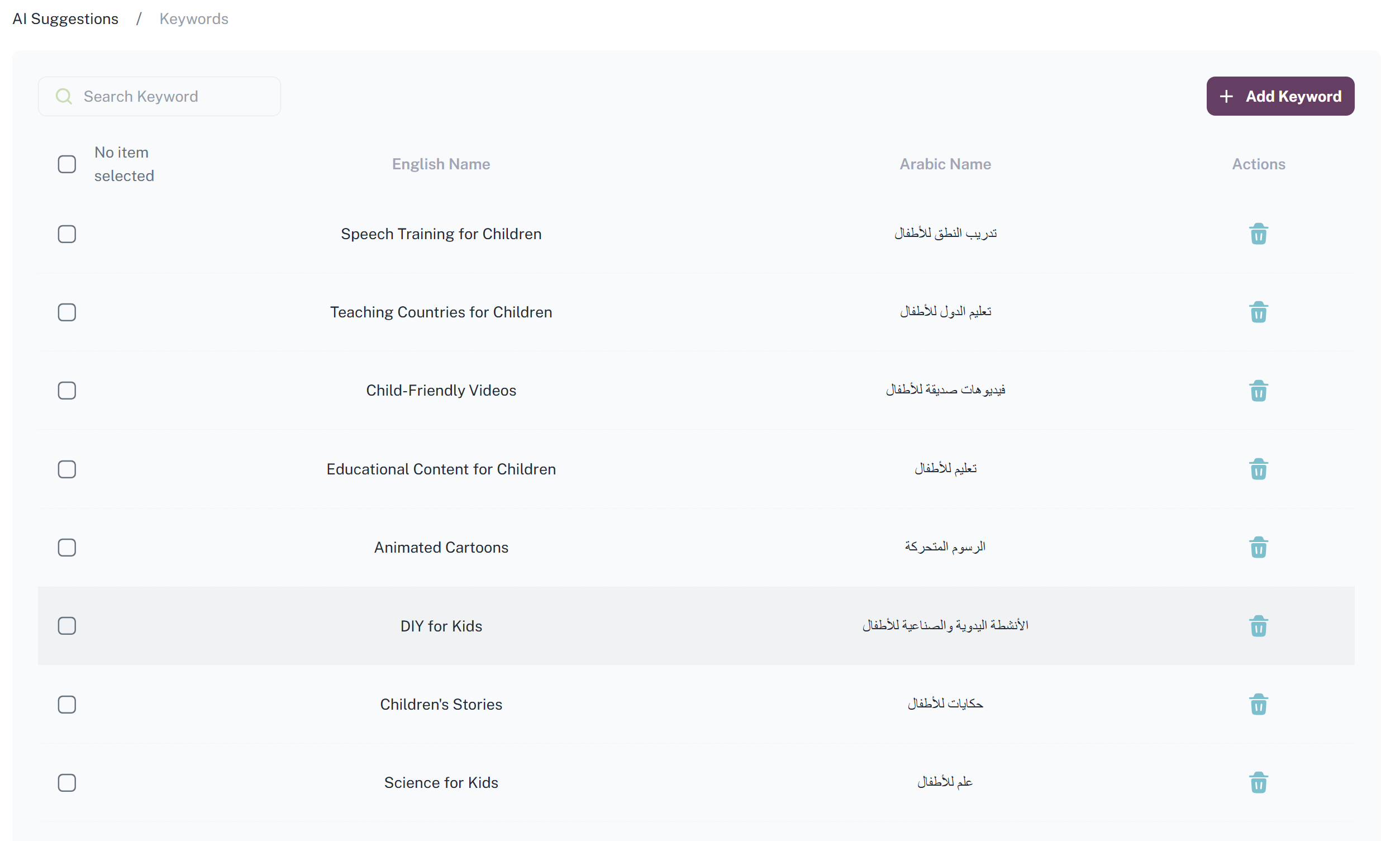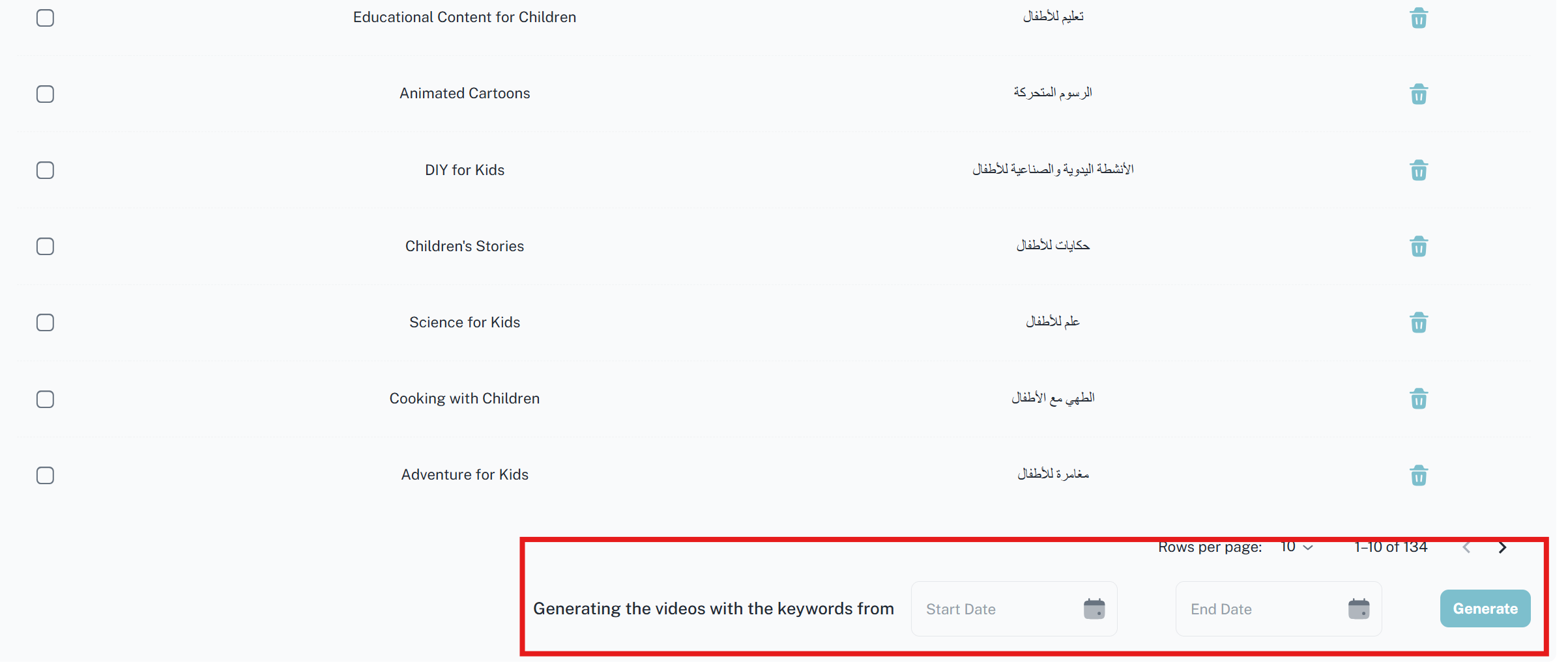 تضم هذه الواجهة قائمة بالكلمات المفتاحية المخصصة للأطفال التي تم استخراجها من القنوات التي تمت اضافتها للمنصة