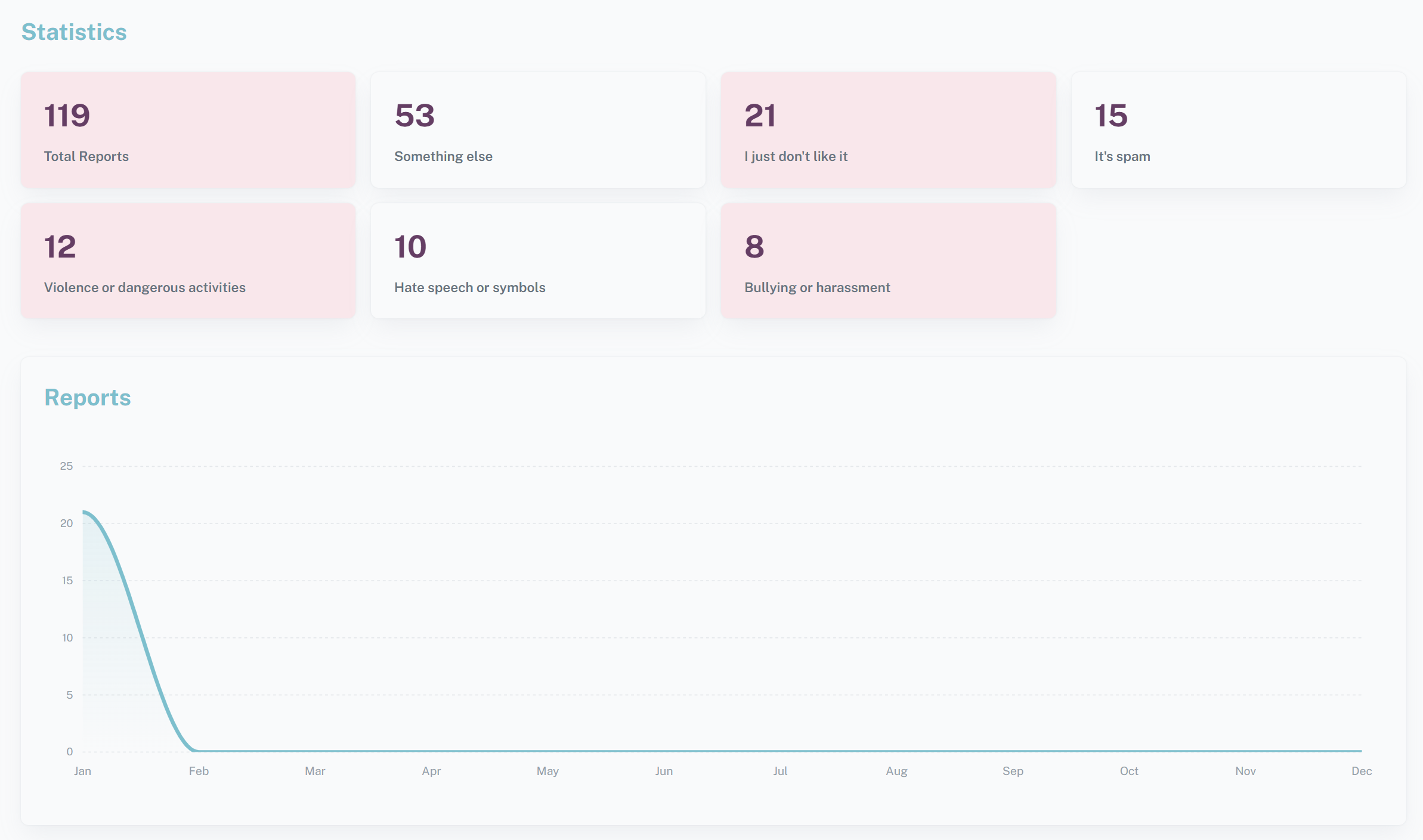 تضم هذه الواجهة إحصائيات حول التبليغات المقدمة من قبل المستخدمين الأطفال فقط على محتوى معين وفق تصنيف لأسباب التبليغات مع عرض لمعلومات عنها لمتابعتها من قبل المسؤولين