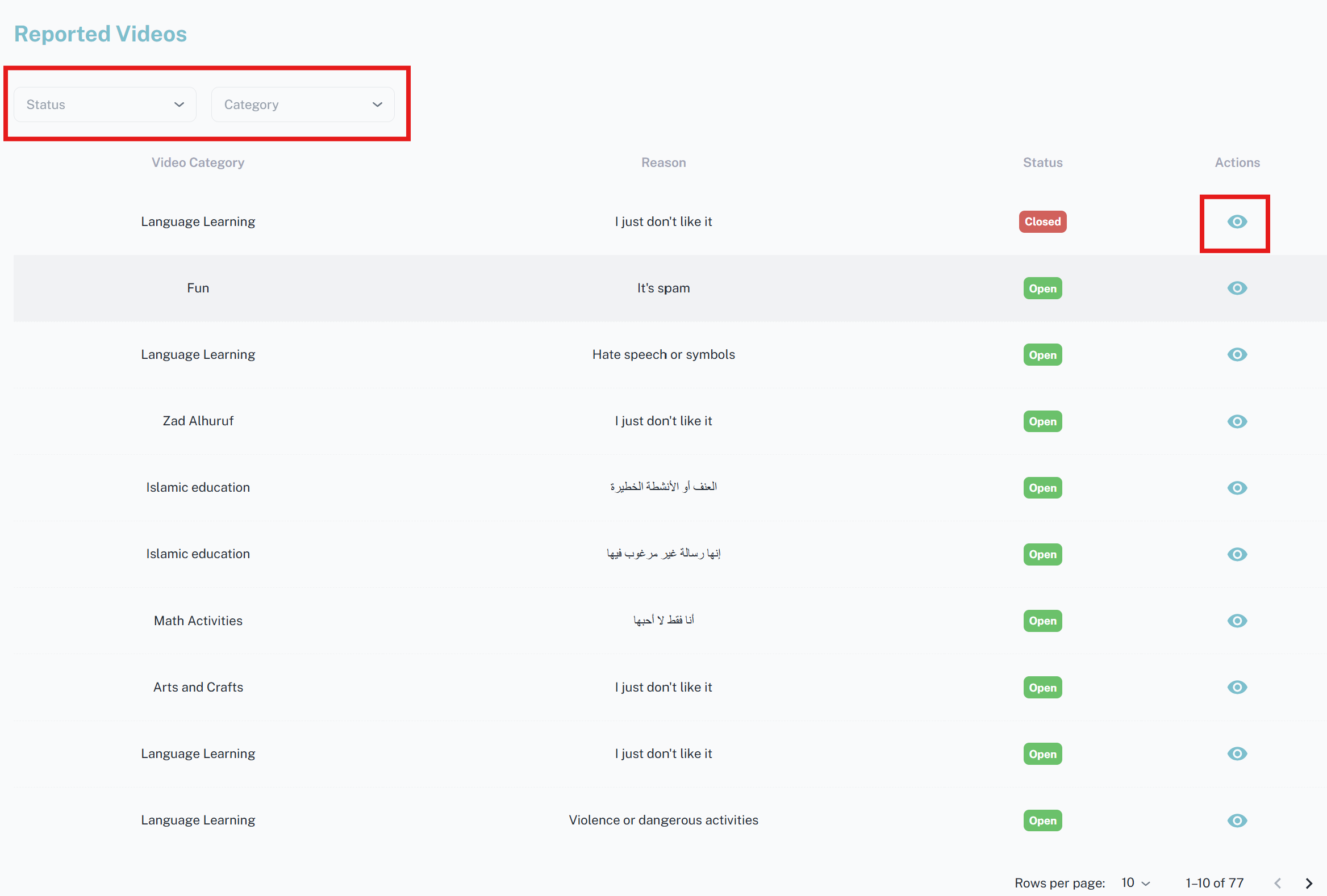 - الترشيح حسب فئة المحتوى الذي تم التبليغ عليه