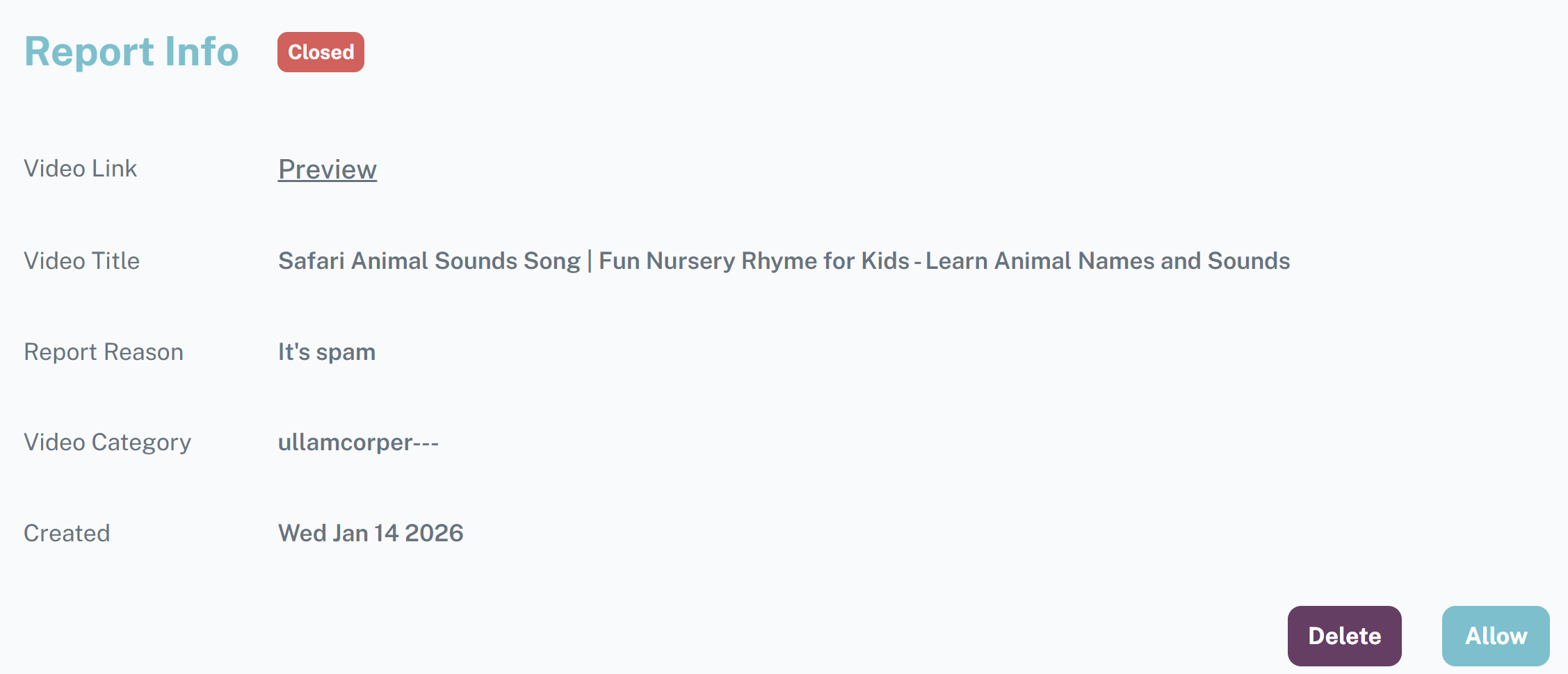 - Allow: عندها سيتم حذف الفيديو من المنصة وتحويل حالة التبليغ إلى closed