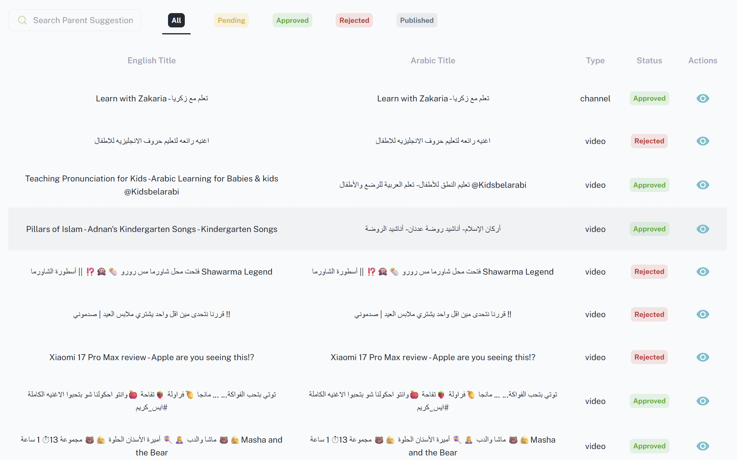 تضم هذه الواجهة قائمة بالاقتراحات المُرسلة من الأباء من خلال التطبيق والتي تشمل اقتراحات من كلا النوعين (قنوات/ فيديوهات)