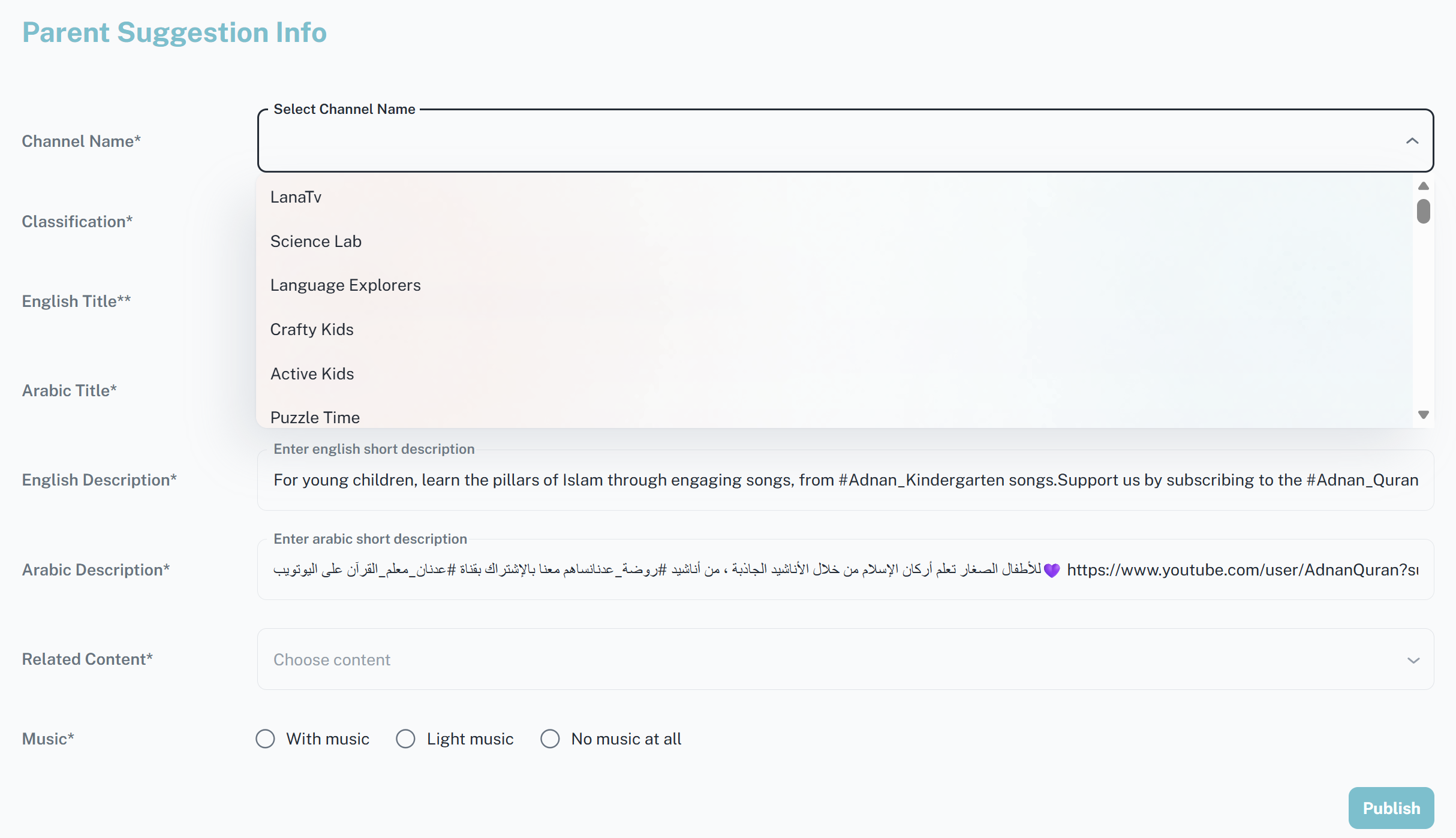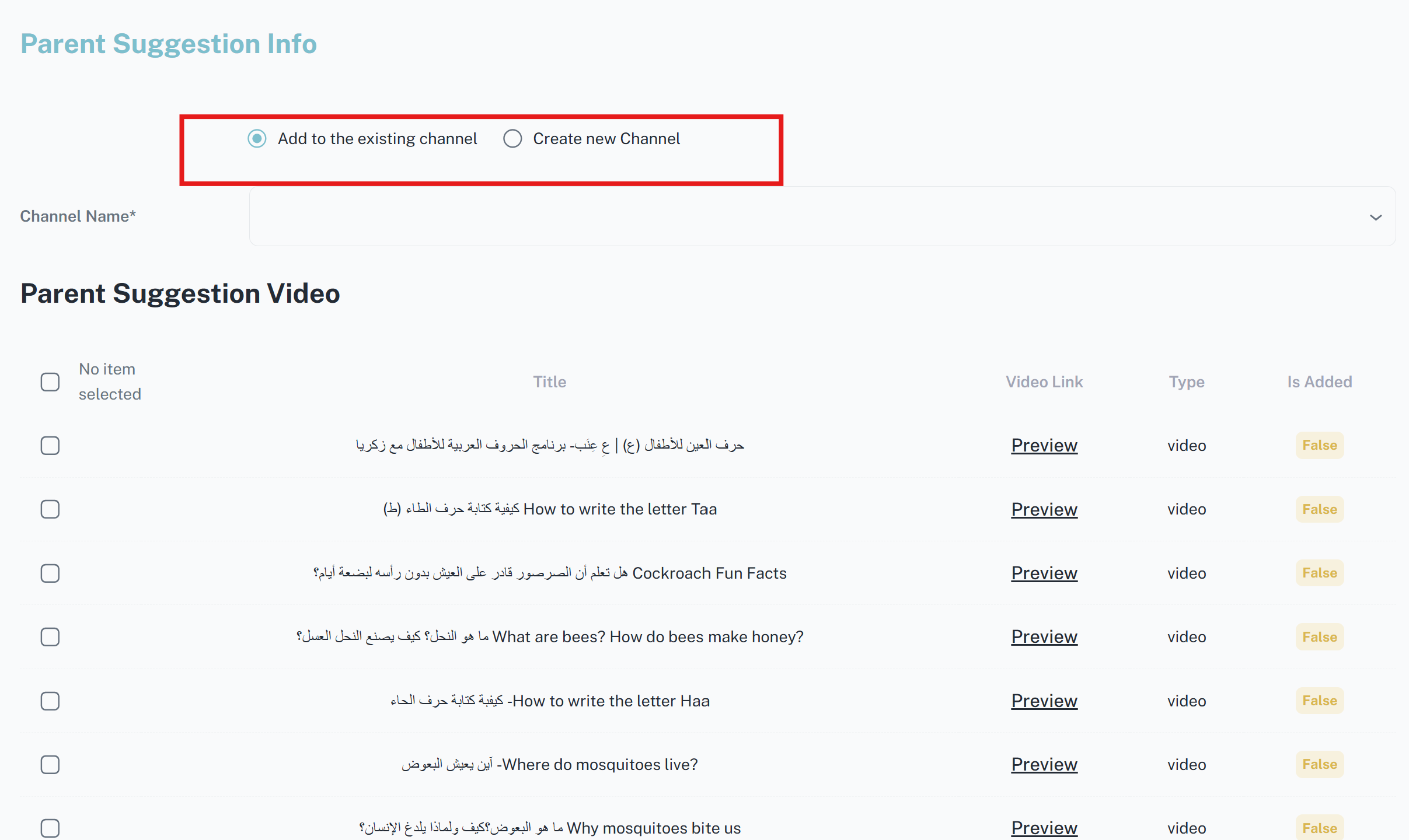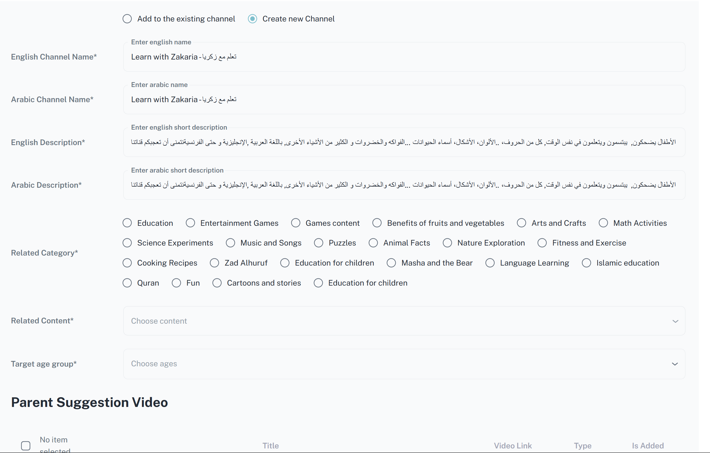 عند عرض معلومات اقتراح من نوع قناة تظهر تفاصيل القناة مترجمة مع سحب لفيديوهاتها على يوتيوب ويمكن للأدمن إضافة عدد كبير من تلك الفيديوهات إلى تلك القناة بعد إنشاءها كقناة جديدة أو إلى قناة موجودة مسبقاً