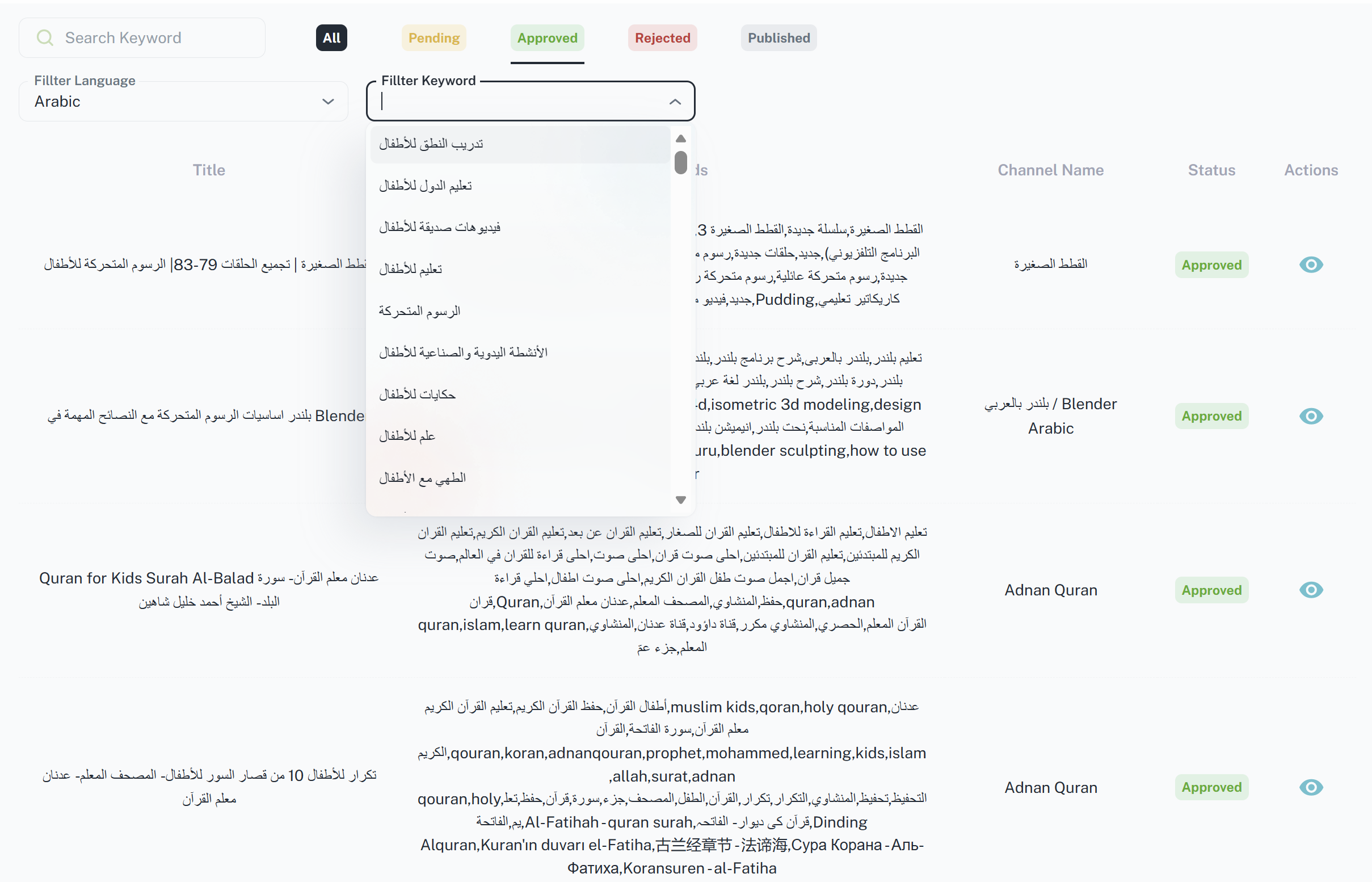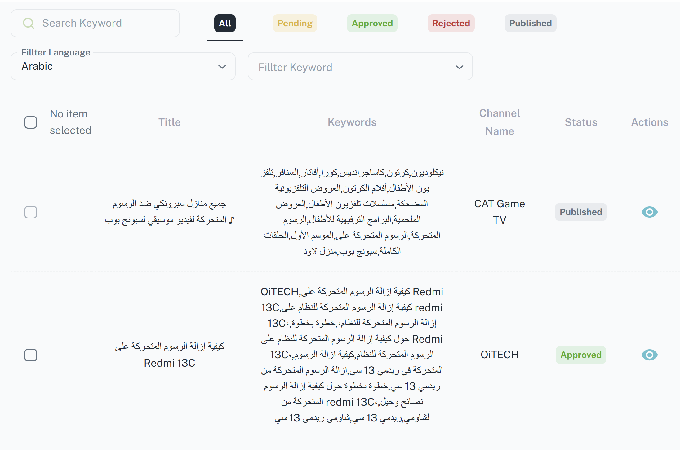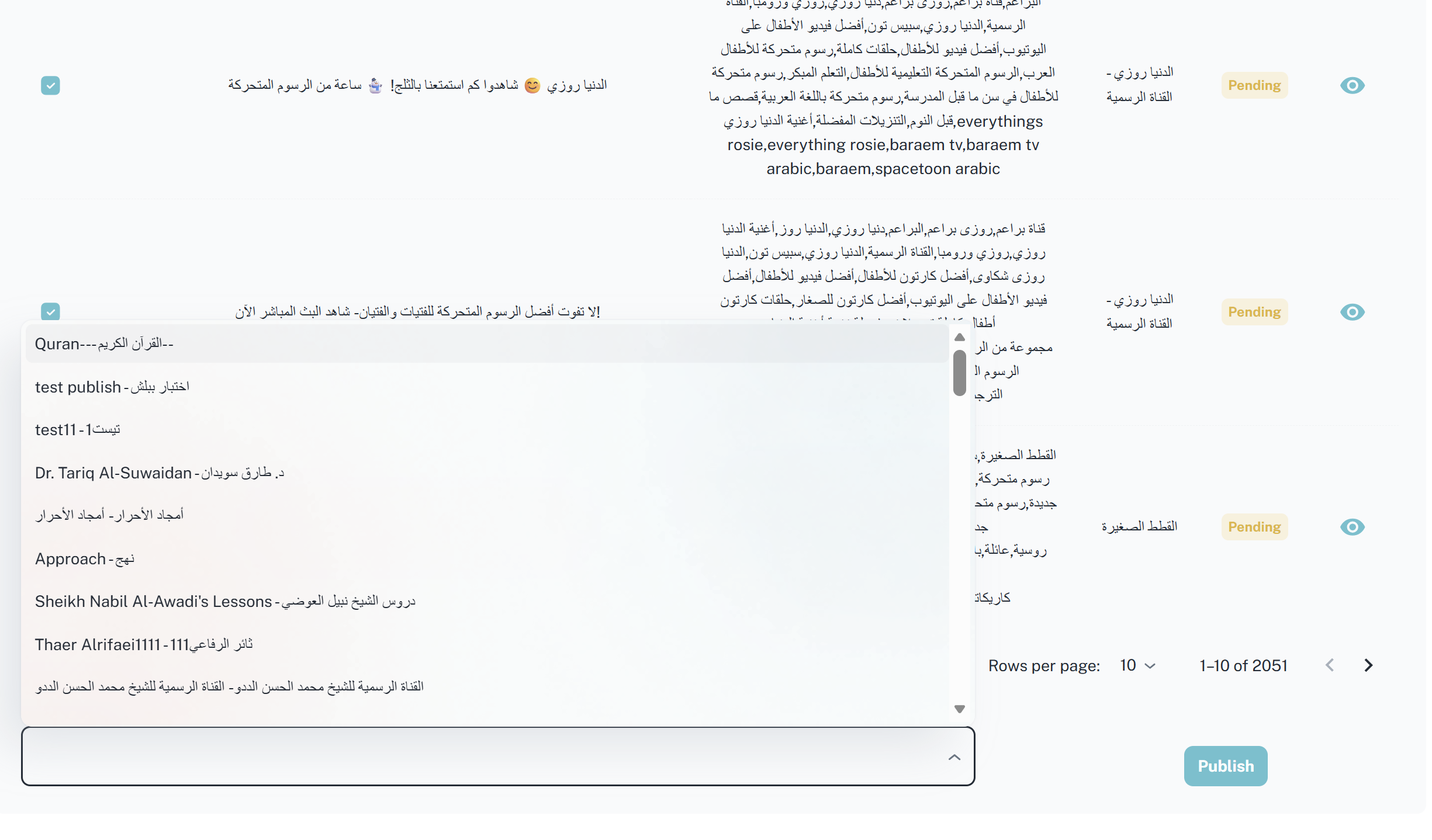 - تحديد قائمة كبيرة من الاقتراحات بحالة pending/ approve كحد أدنى 50 فيديو دفعة واحدة واختيار قناة ليتم نشر الفيديوهات ضمنها مباشرة